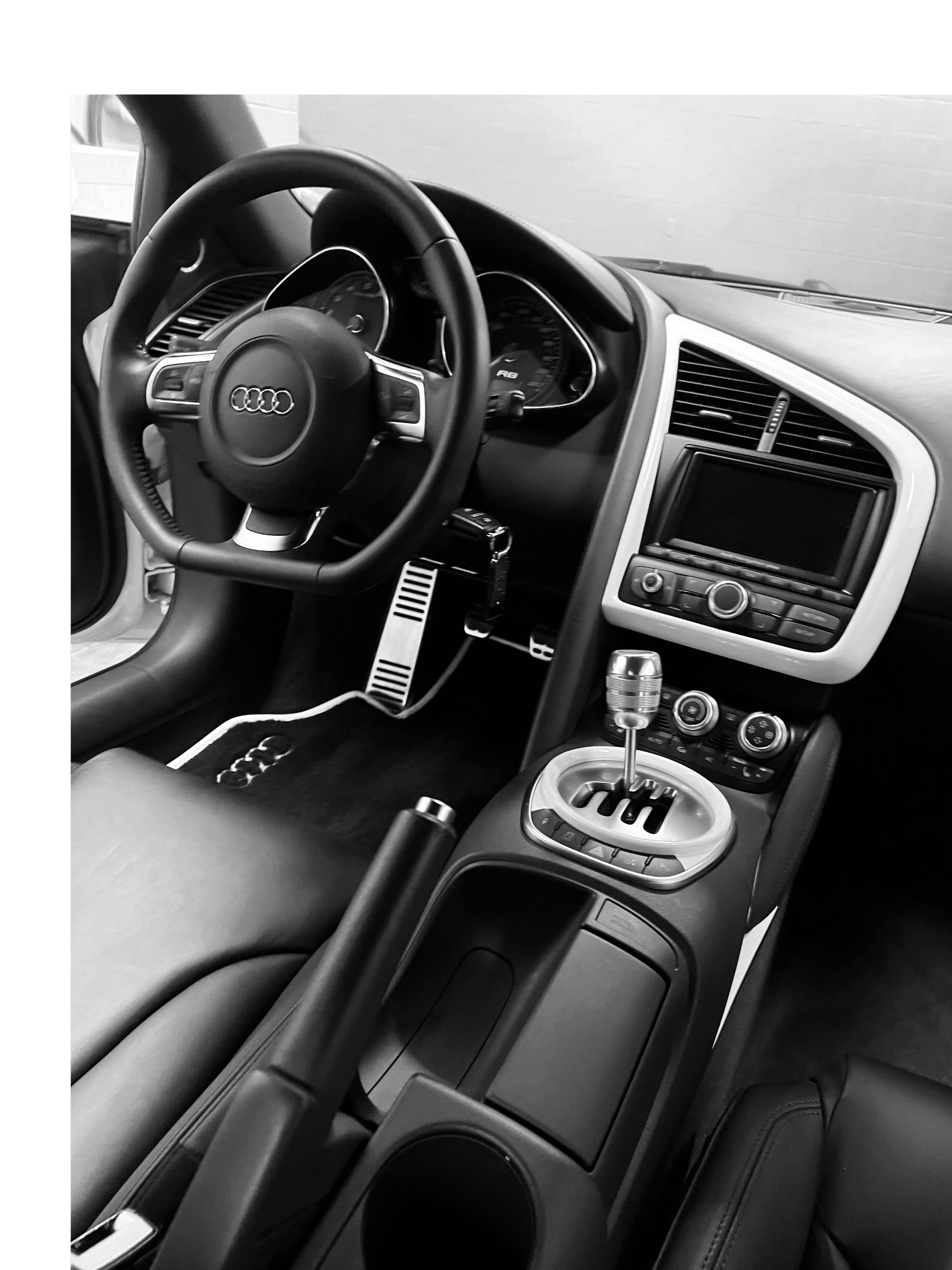 Black and white photo of an Audi car interior, showing the steering wheel, dashboard with instrument cluster, center console with gear shifter, climate controls, and a large screen display.